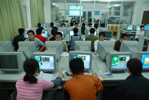 数控工艺设计与编程实验室投资50万元,有55个工作点,安装企业生产中使用最多的设计编程应用软件。设置了模拟机床操作和检验程序的仿真操作系统,并与数控原理实验室联网通讯。数控工艺设计与编程实验室与数控原理实验室配合可使学生完成工程识图、产品造型、程序设计及后处理、计算机通讯、机床工作调查、刀具选用、生产产品等数控加工的全部工作过程。