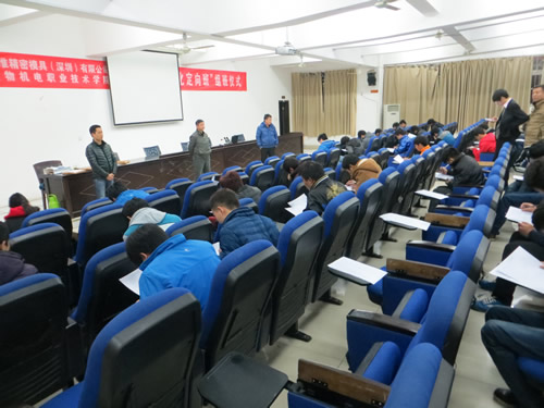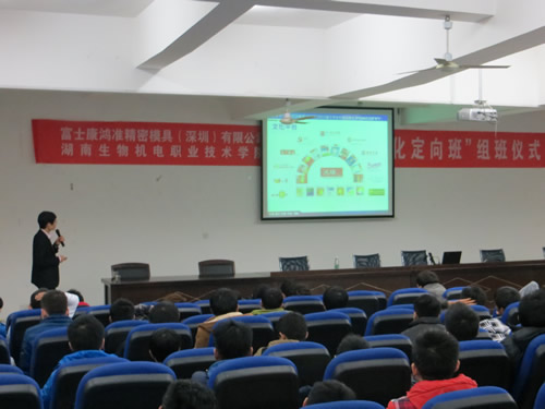 12月18日,深圳富士康鸿准事业群(简称C次集团)人力资源处自动化专业校园招募科经理高胤一行4人来到我院组建“2013级自动化人才定向班”。系主任白长城、党总支书记何荣誉、学工办主任金华及部分班主任老师,2013级机电设备维修与管理、机电一体化技术 、电气工程技术、应用电子技术、电子信息工程技术等专业200多名学生参加了组班仪式。