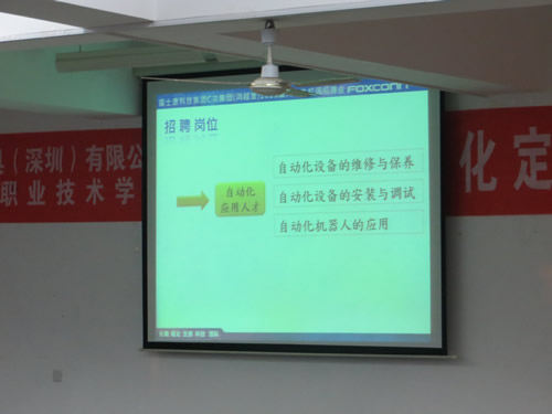 首届“富士康-自动化人才定向班”于2011年10月组建,从机电一体化技术中挑选学生进行“订单式”培养,顶岗实习期间提供三个月强化培训,上岗后从事自动化设备(工业机器人)的维护与应用。富士康集团制定了庞大的投资计划,在未来三年实现“百万台机器人”目标,现在我院已向富士康C次集团输送2010级、2011级、2012级“自动化定向班”学员150多人。